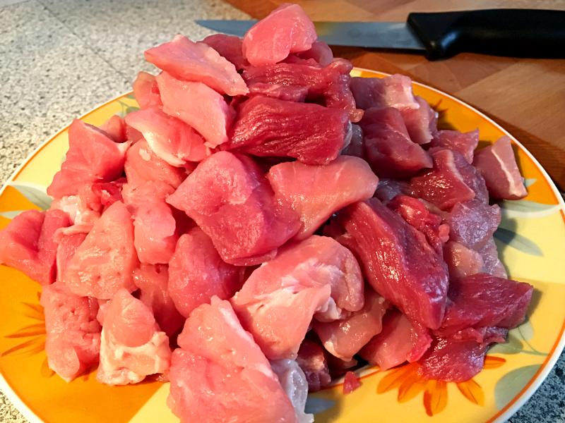 Die Zwiebeln, den Paprika und die Knoblauchzehe in kleine Würfel schneiden und in einen großen Topf geben in dem sich Sonnenblumenöl befindet. In anderen Rezepten wird auch Braten Schmalz benutzt, natürlich kann auch dieses genommen werden. Den Topf auf Stufe 3 stellen (bei einem Elektroherd ansonsten ein drittel der Gesamtleistung) und die Zwiebeln, den Knoblauch sowie die Paprikawürfel glasig anschwitzen bis goldgelb schmoren. Bei mir ist das ca. 20 bis 30 Minuten, in der zwischen Zeit kann man das Fleisch schon mal in kleine Mundgerechte Stücke schneiden. Persönlich bevorzuge ich lieber etwas kleinere Stücke.