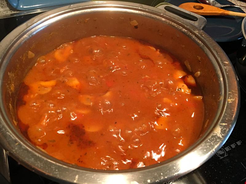 Nun das Fleisch mit dem Paprika Sud anbraten. Das scharfe anbraten hat bei mir leider nie funktioniert, das leider immer noch zu viel Restflüssigkeit da war. Deswegen habe ich auch schon die Champignons an dieser Stelle mit eingebracht da dies auch noch Flüssigkeit abgeben. Das waren bei mir ca. 15 bis 20 Minuten. Dann wurde das anbraten mit dem Rotwein gelöscht und auch die Rinder Brühe kann hinzukommen.